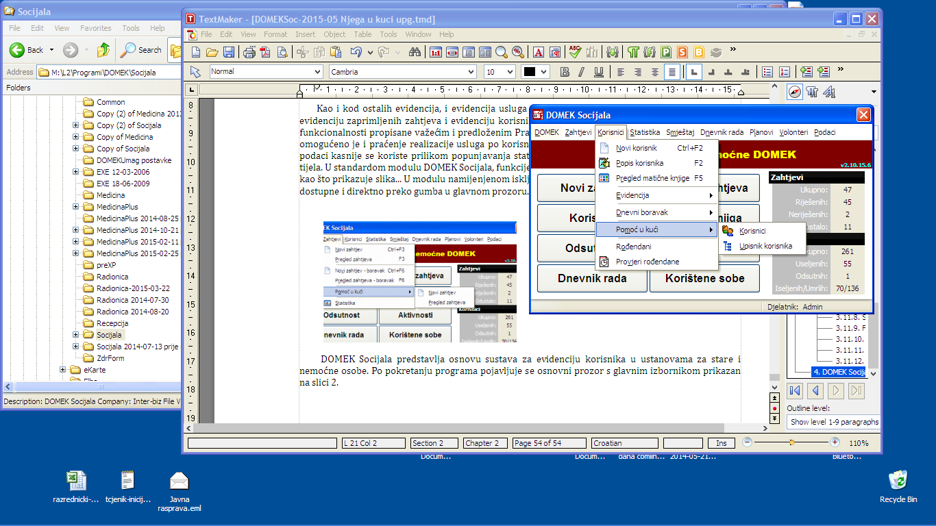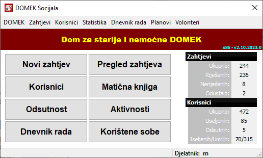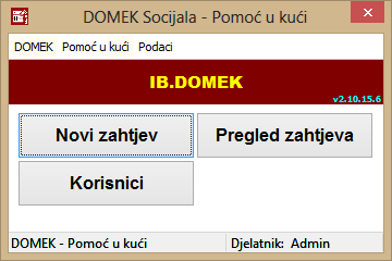 Kao i kod ostalih evidencija, i evidencija usluga pomoći u kući svodi se na dva osnovna dijela - evidenciju zaprimljenih zahtjeva i evidenciju korisnika usluge. Preko tih evidencija realiziraju se sve funkcionalnosti propisane važećim i predloženim Pravilnikom. Osim same evidencije korisnika usluge, omogućeno je i praćenje realizacije usluga po korisnicima i, naravno, na razini ustanove. Svi uneseni podaci kasnije se koriste prilikom popunjavanja statističkih i drugih obrazaca traženih od nadležnih tijela. U standardom modulu DOMEK Socijala, funkcije su dostupne preko izbornika Zahtjevi i Korisnici, kao što prikazuje slika... U modulu namijenjenom isključivo vođenju spomenutih evidencija, funkcije su dostupne i direktno preko gumba u glavnom prozoru.