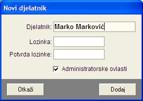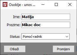Sučelje za pregled popisa osoblja pokreće se stavkom Podaci - Osoblje - Popis u glavnom izborniku (slika 4.23.), dok se novo osoblje unosi stavkom Podaci - Osoblje - Novi (slika 4.24.).