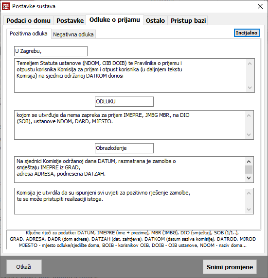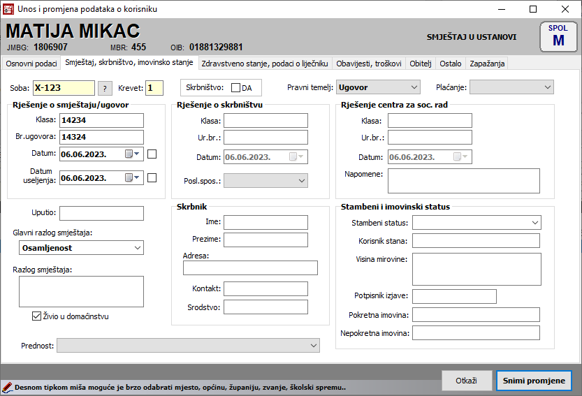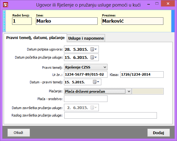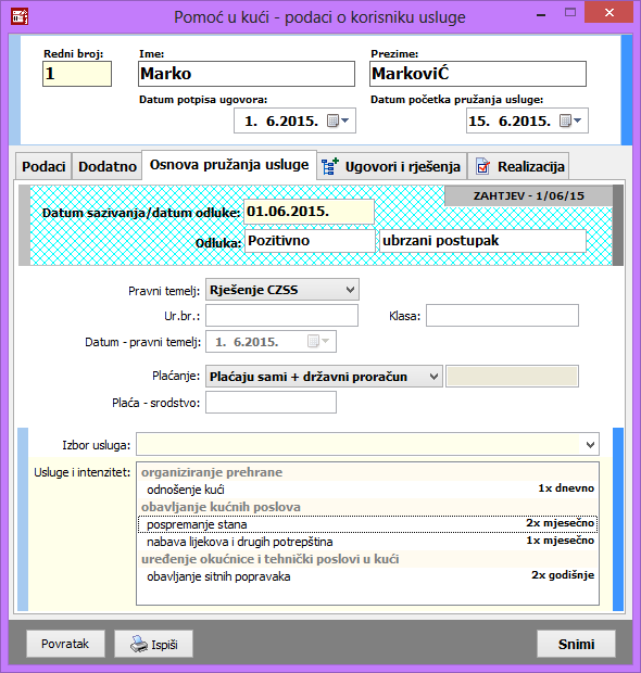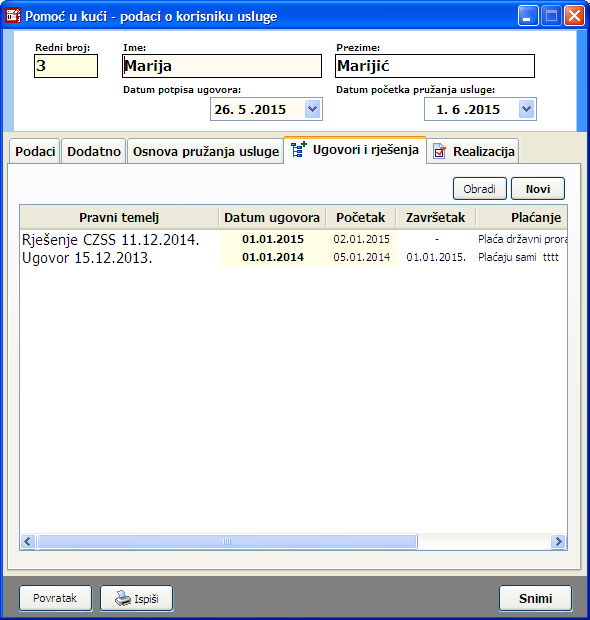Kako je kasnije opisano (4.3.2), za svakog korisnika je omogućen unos proizvoljnog broja Ugovora i Rješenja - uz svaki Ugovor i/ili Rješenje unose se i ti podaci (temelj, plaćanje, detalji o uslugama uz koje je vezan Ugovor ili Rješenje). Međutim, podaci uneseni u sam prozor s podacima o korisniku smatraju se »glavnim« i kao prvi se ispisuju na osobnom kartonu korisnika.