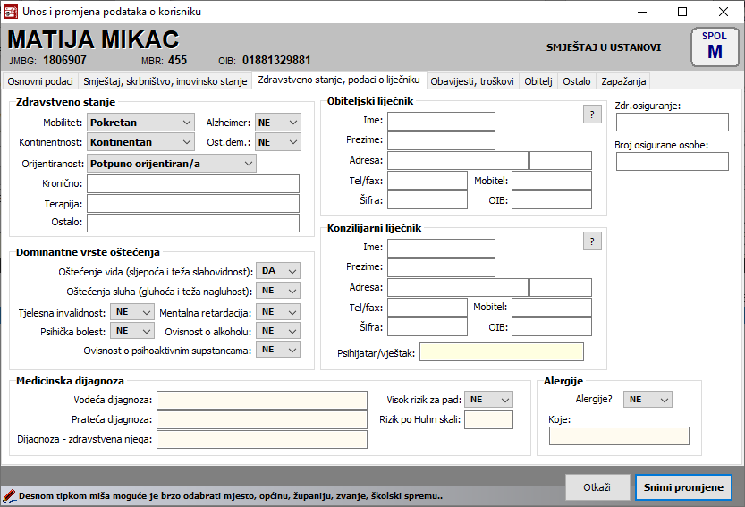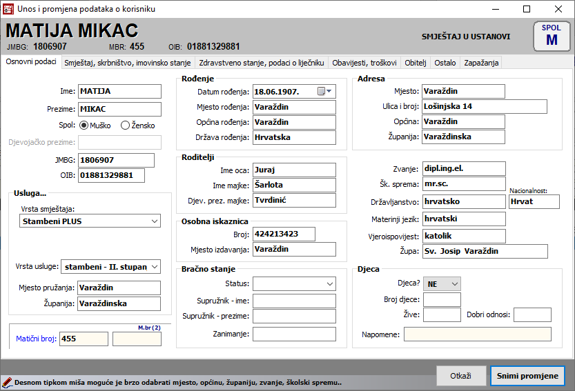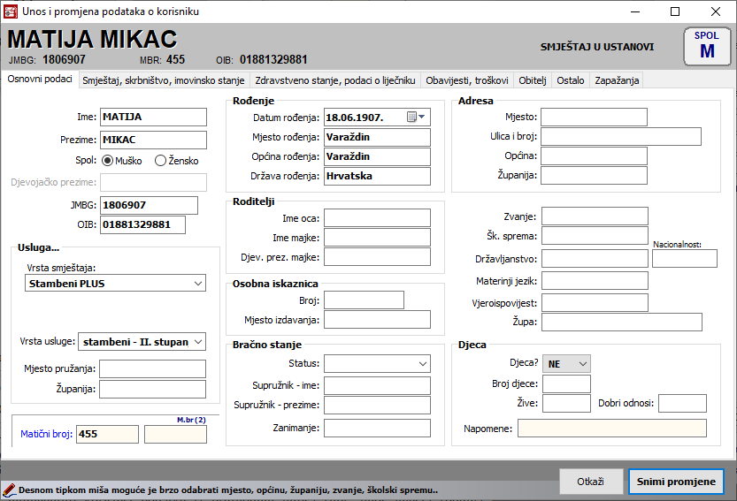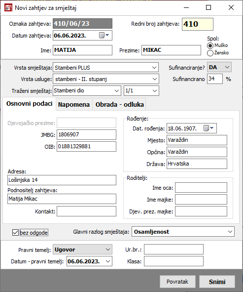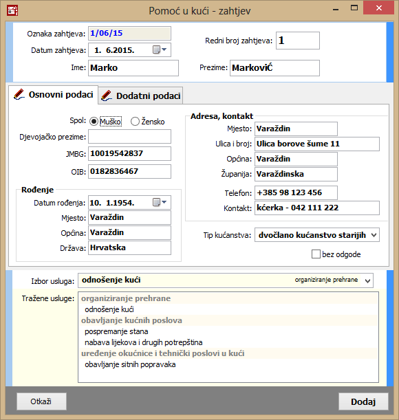 Pod Osnovni podaci unose se standardni podaci o korisniku - podaci o datumu rođenja, adresi, tipu kućanstva u kojem živi.
