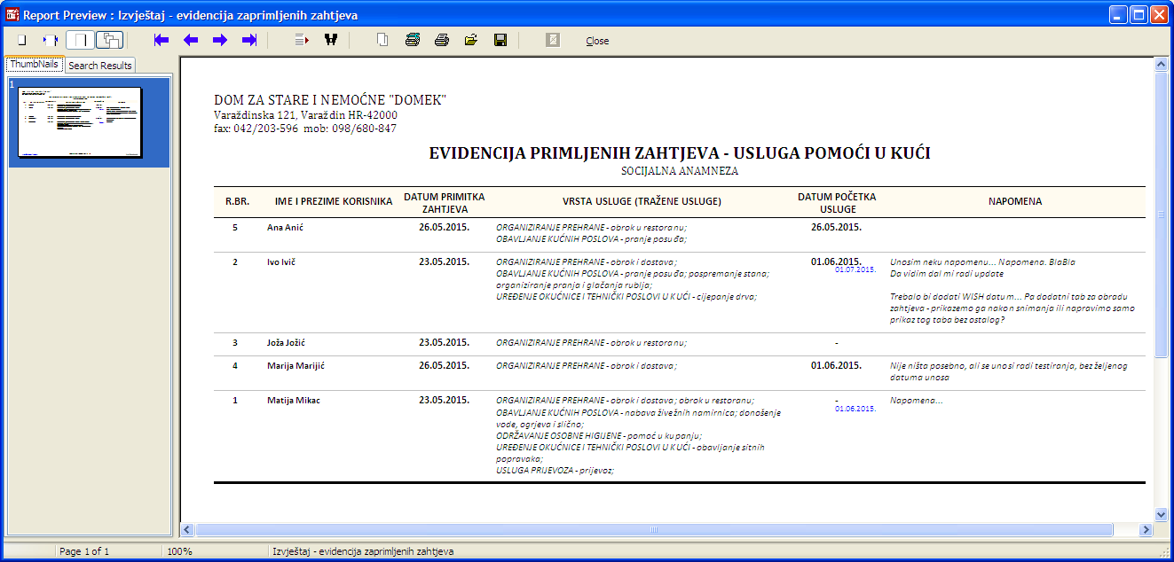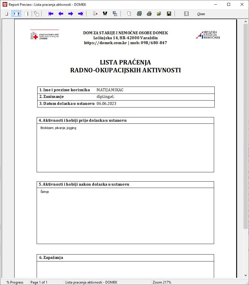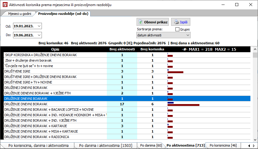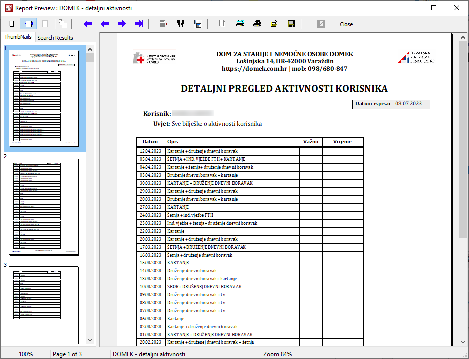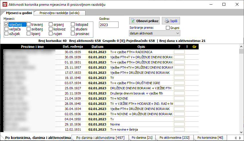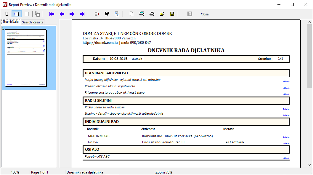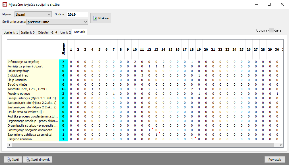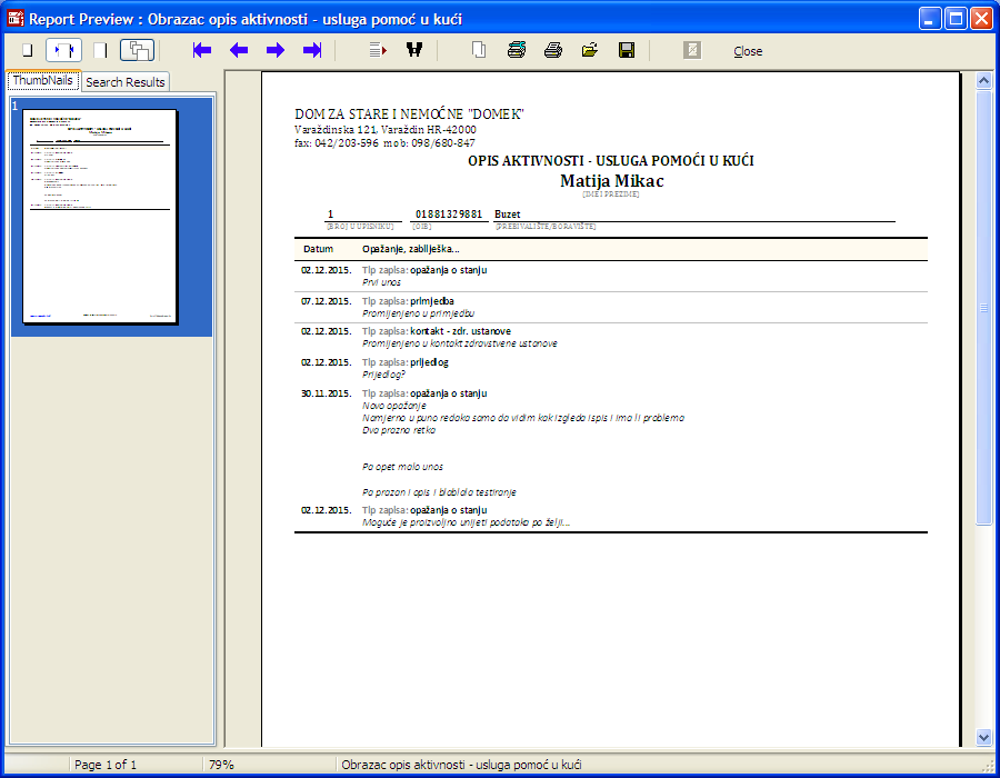 Naravno, za svakog pojedinog korisnika moguće je ispisati detaljni pregled aktivnosti za željeno razdoblje, kao i standardni izvještaj prikazan na slici (izvještaj zapravo sadrži zapise socijalnog radnika ili radnog terapeuta, a njemu se u praksi obično priloži i detaljni ispis provedenih aktivnosti za tog korisnika).