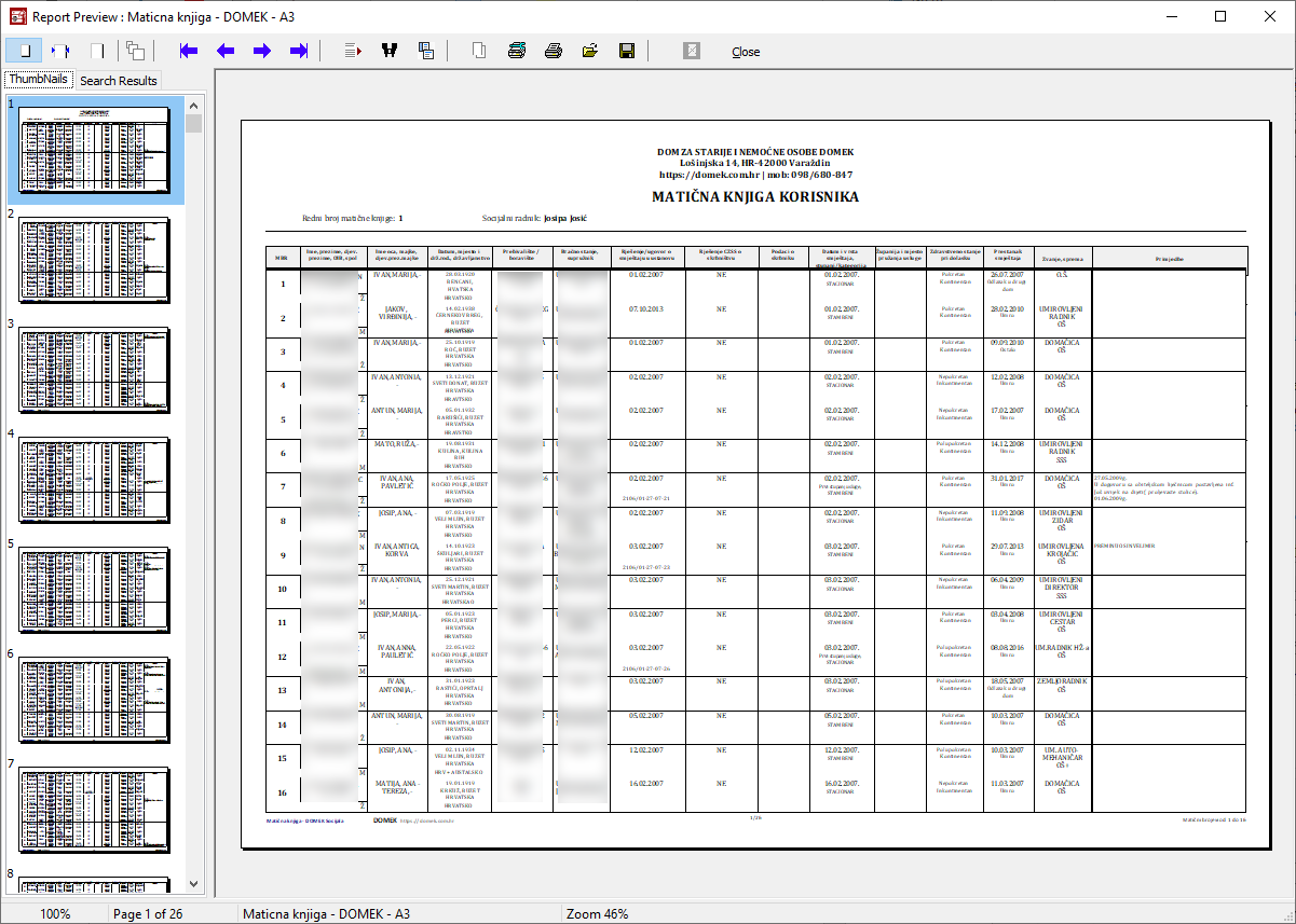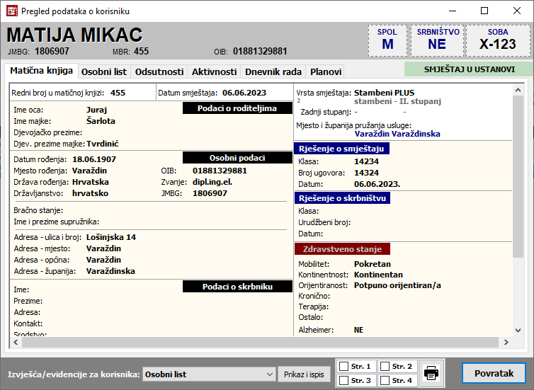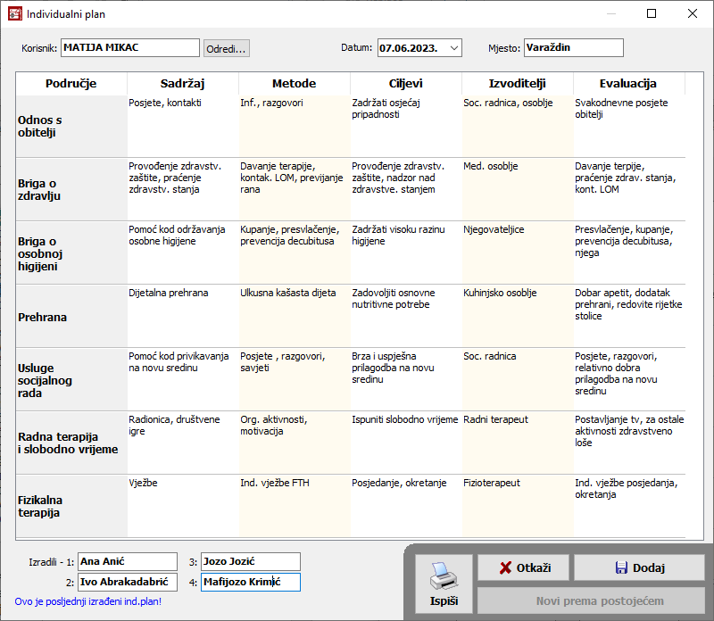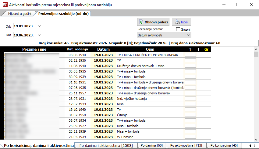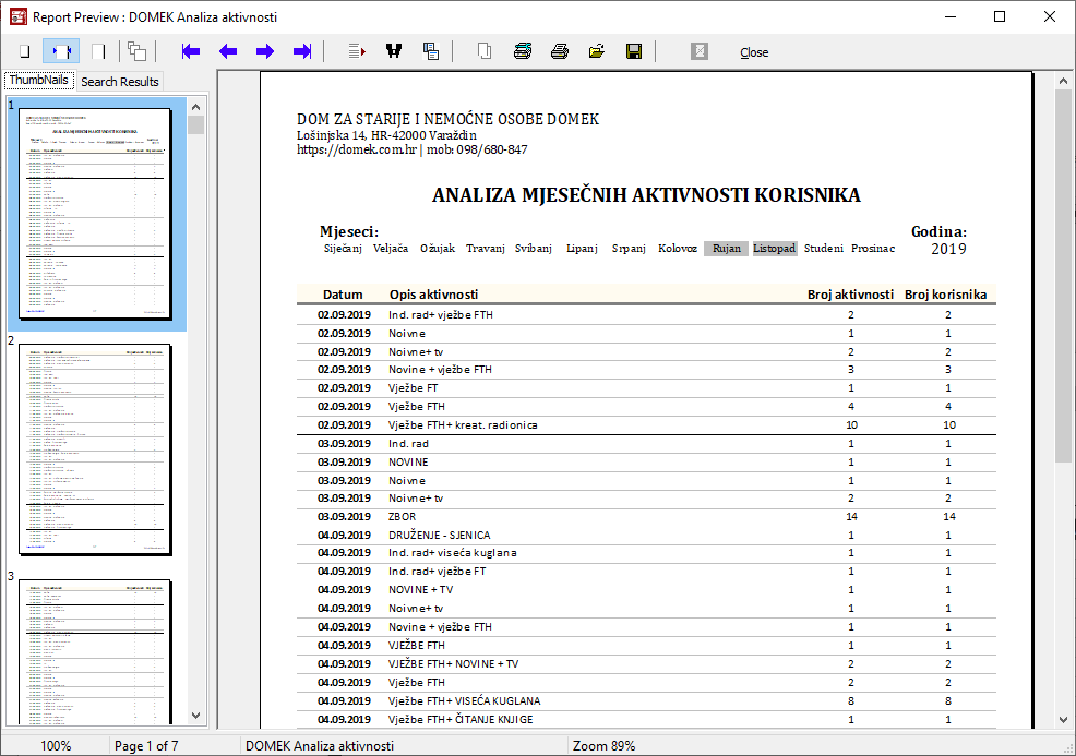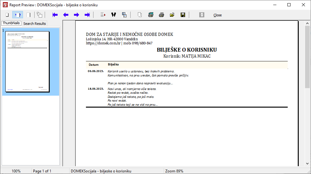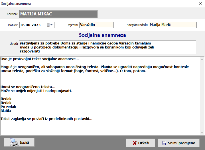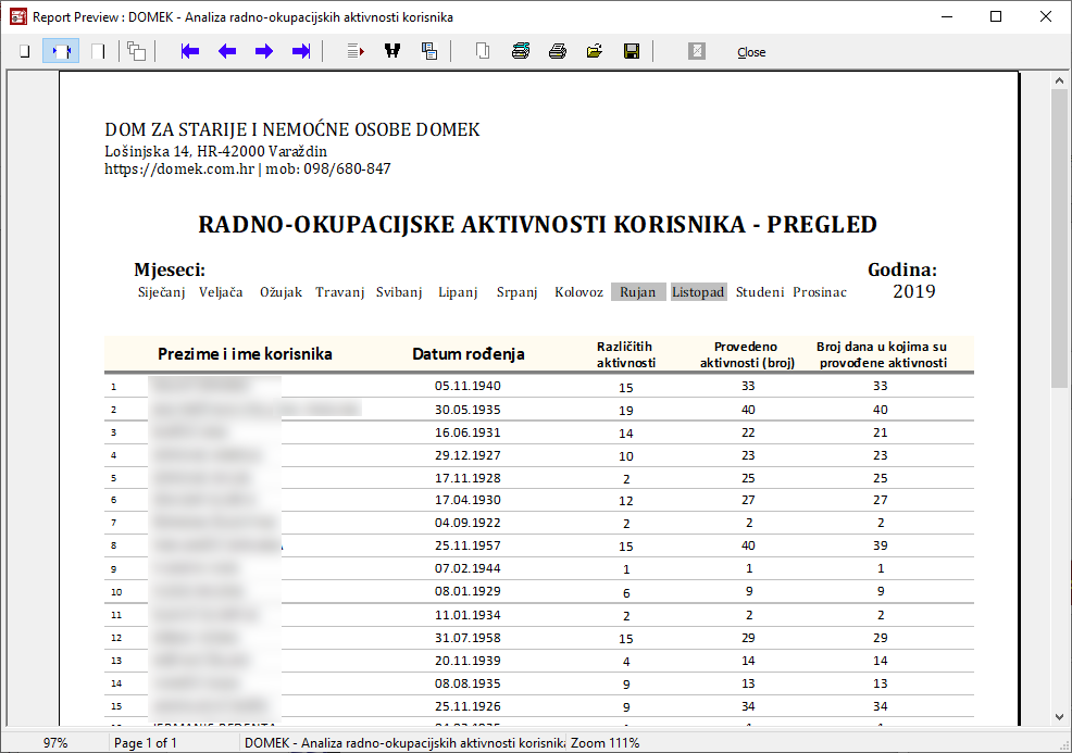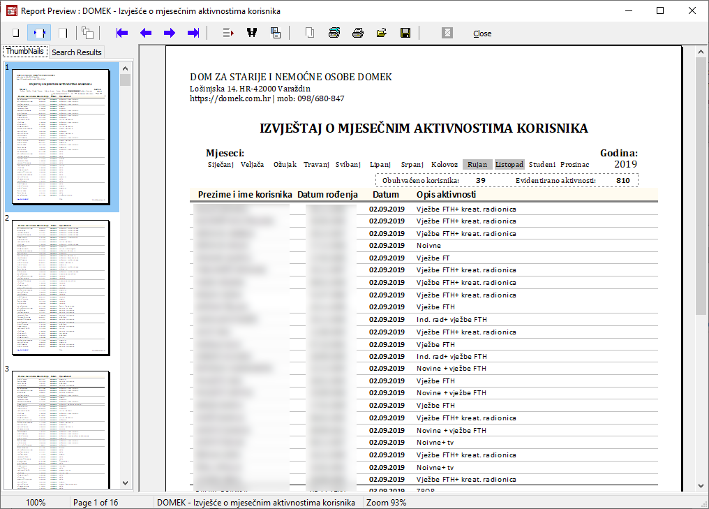 Naravno, za svakog pojedinog korisnika moguće je ispisati detaljni pregled aktivnosti za željeno razdoblje, kao i standardni izvještaj prikazan na slici (izvještaj zapravo sadrži zapise socijalnog radnika ili radnog terapeuta, a njemu se u praksi obično priloži i detaljni ispis provedenih aktivnosti za tog korisnika).