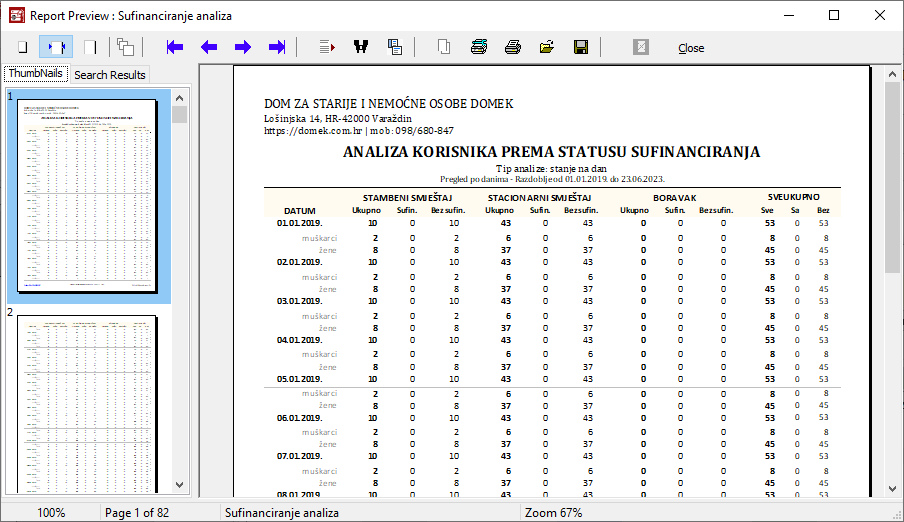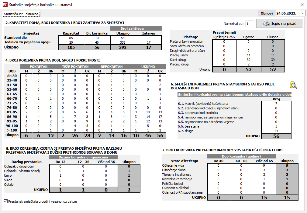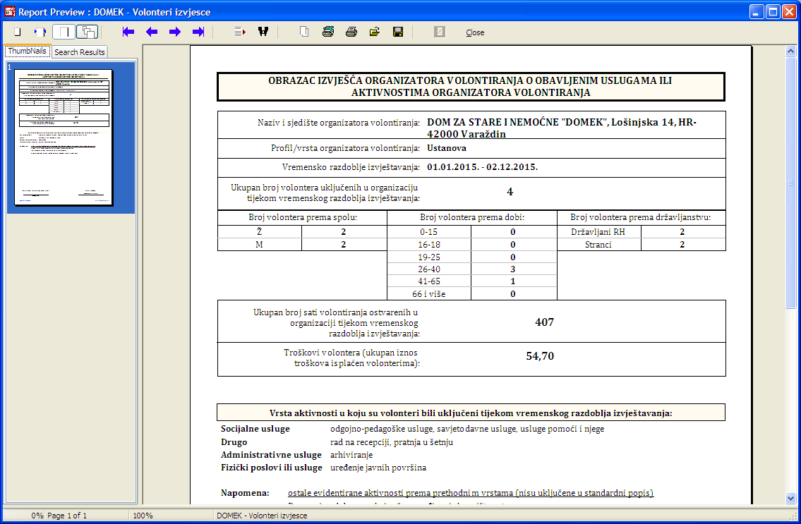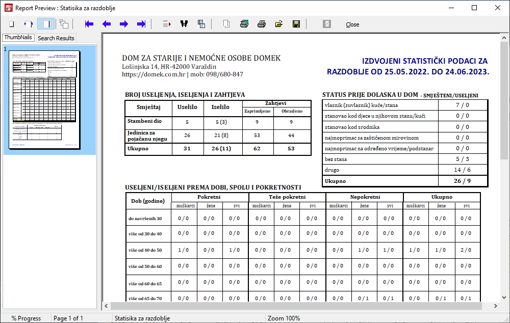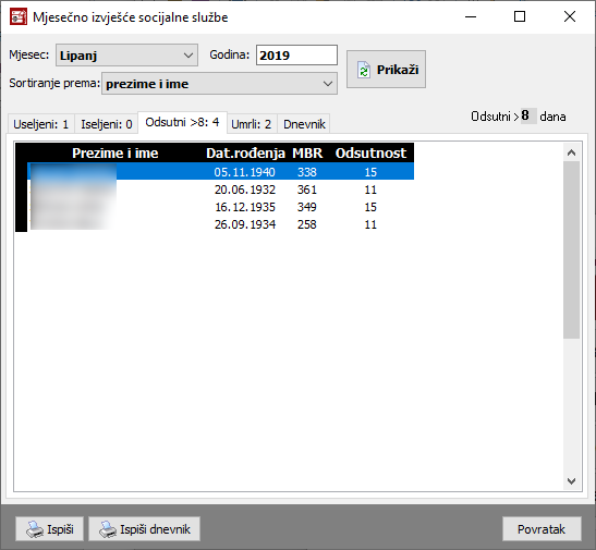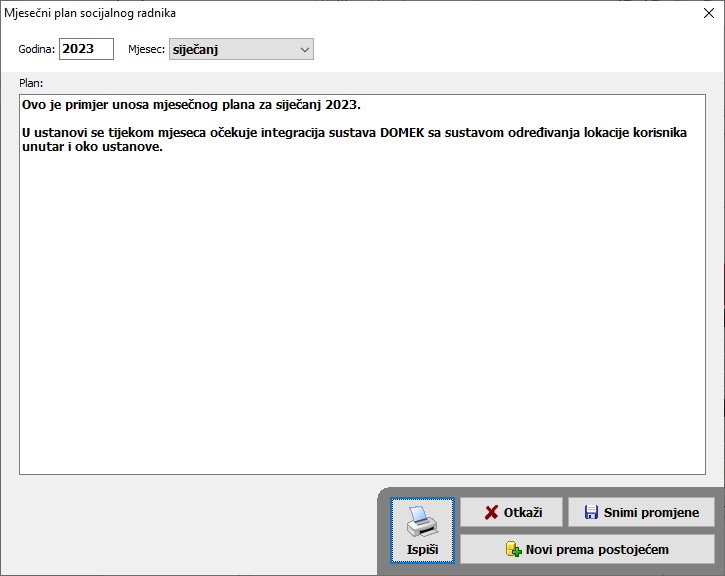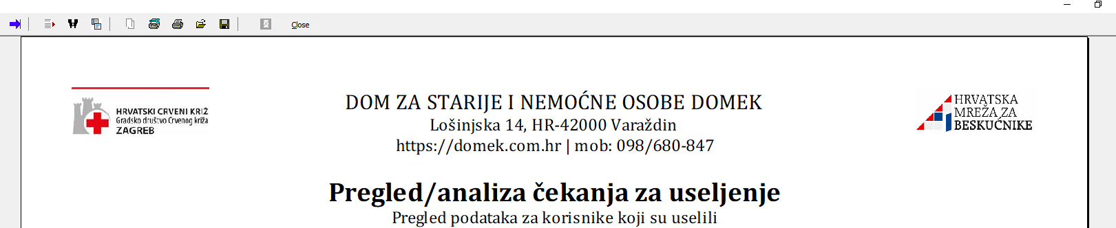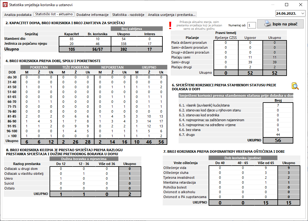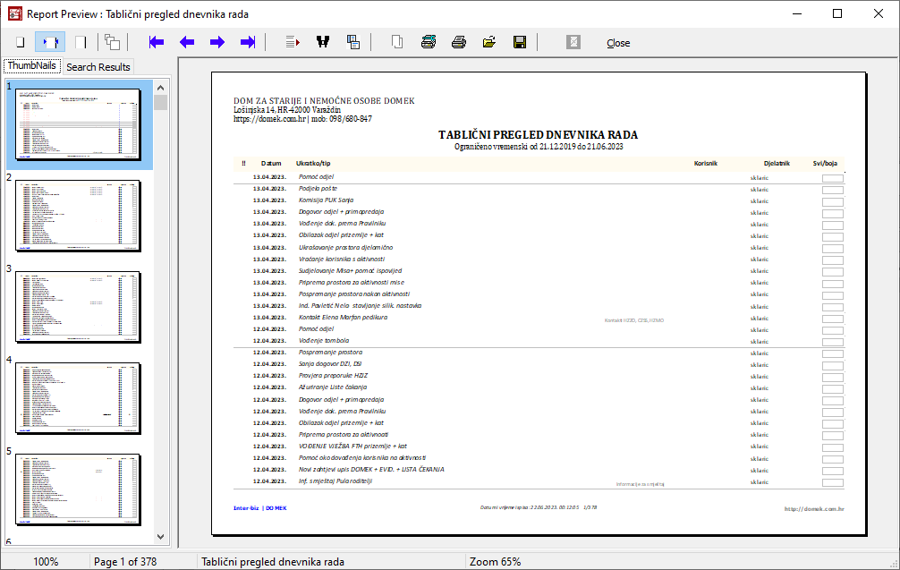Naravno, za svakog pojedinog korisnika moguće je ispisati detaljni pregled aktivnosti za željeno razdoblje, kao i standardni izvještaj prikazan na slici (izvještaj zapravo sadrži zapise socijalnog radnika ili radnog terapeuta, a njemu se u praksi obično priloži i detaljni ispis provedenih aktivnosti za tog korisnika).
