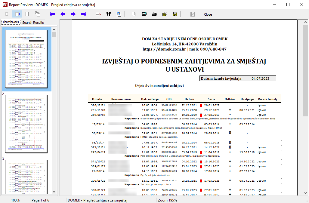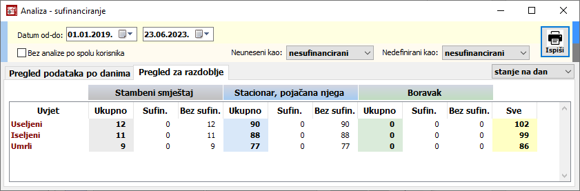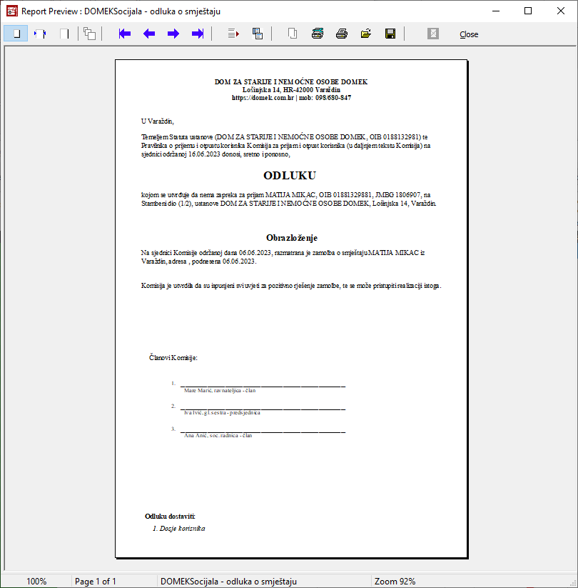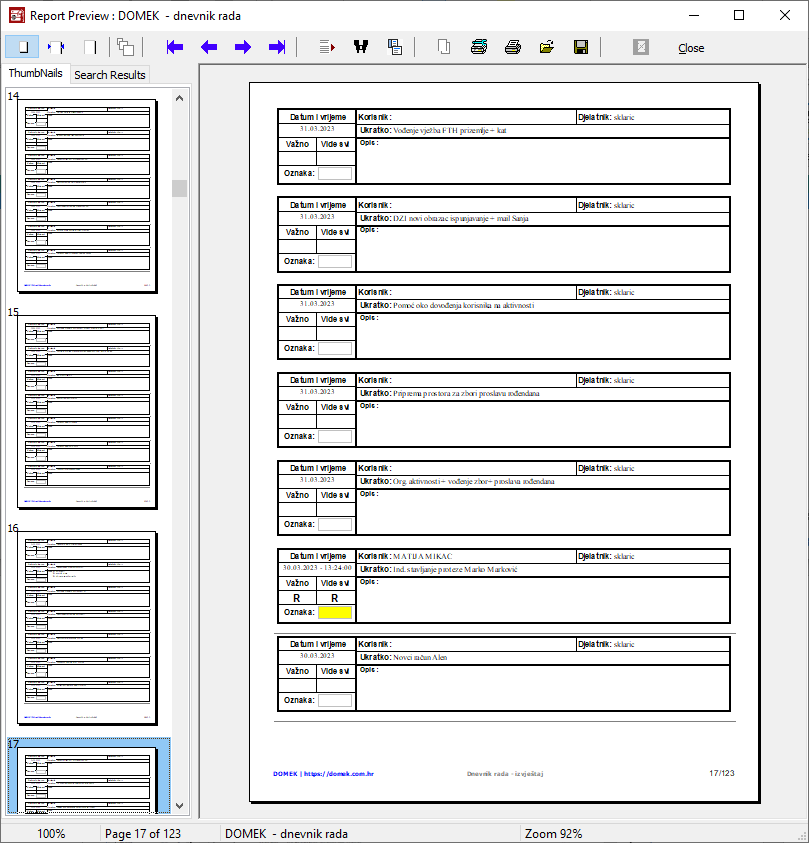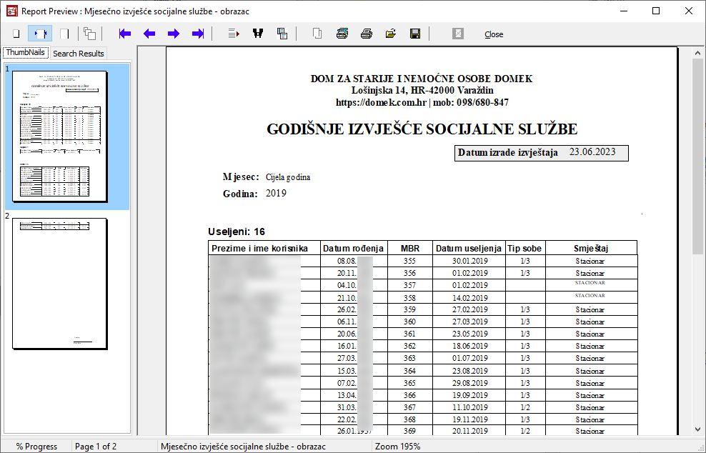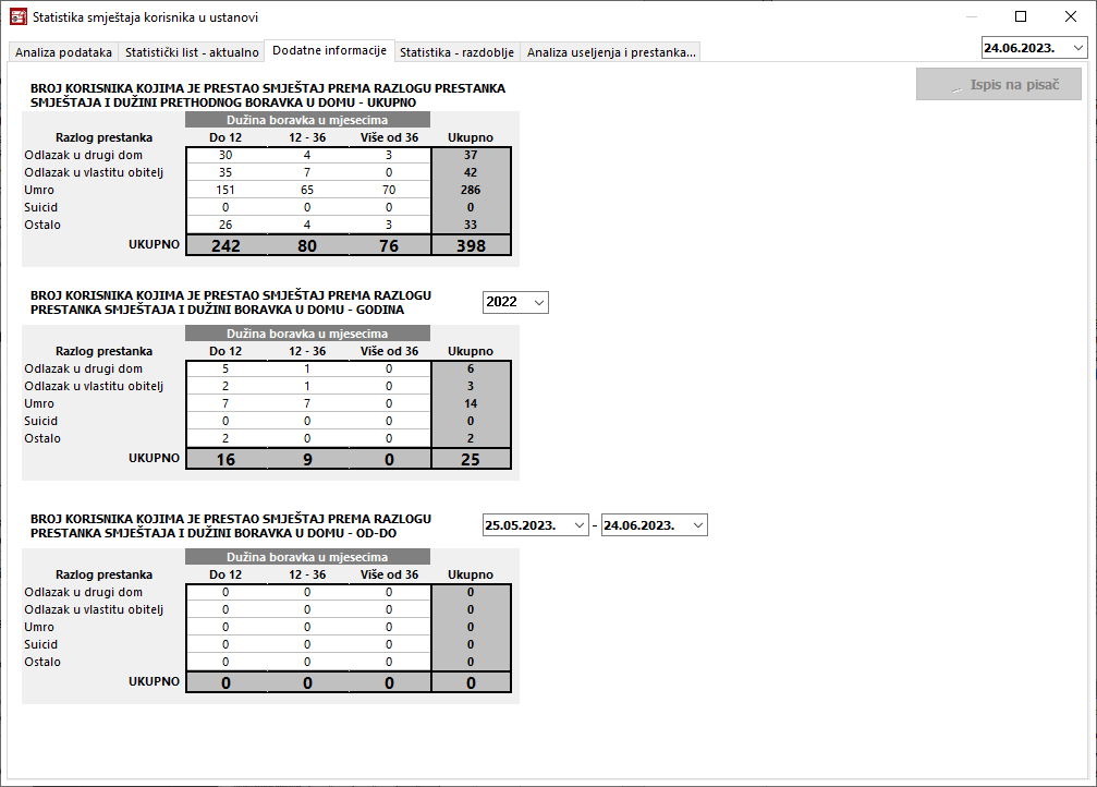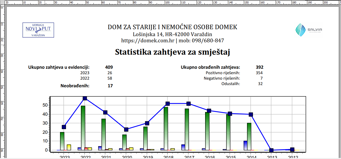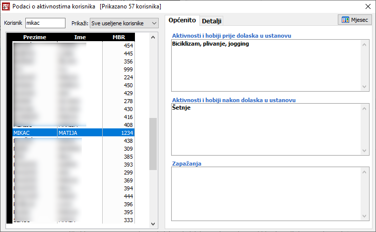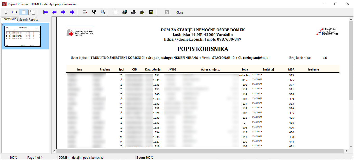 Naravno, za svakog pojedinog korisnika moguće je ispisati detaljni pregled aktivnosti za željeno razdoblje, kao i standardni izvještaj prikazan na slici (izvještaj zapravo sadrži zapise socijalnog radnika ili radnog terapeuta, a njemu se u praksi obično priloži i detaljni ispis provedenih aktivnosti za tog korisnika).