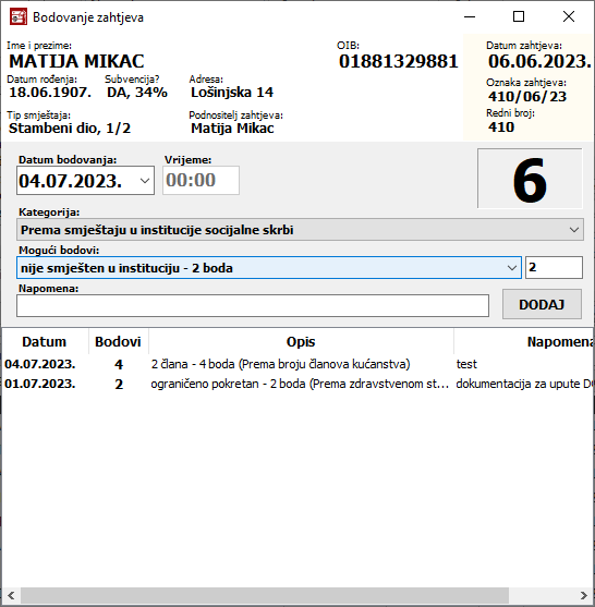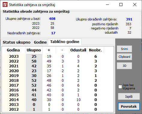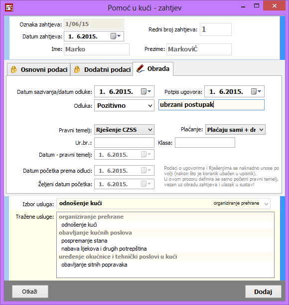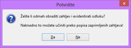 Nakon unosa osnovnih podataka, gumbom Dodaj provjeravaju se uneseni podaci i, ukoliko je sve u redu, posprema zahtjev u evidenciju. Zaprimljeni zahtjev potrebno je obraditi u nekom trenutku - ukoliko se zahtjevi unose paralelno s obradom, nakon unosa novog zahtjeva program će ponuditi mogućnost obrade odmah po zaprimanju zahtjeva - prikazuje se upit kao na slici 4.6.