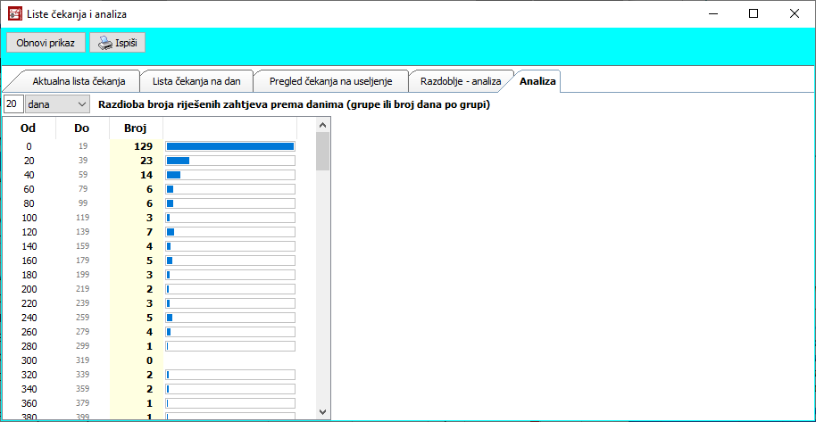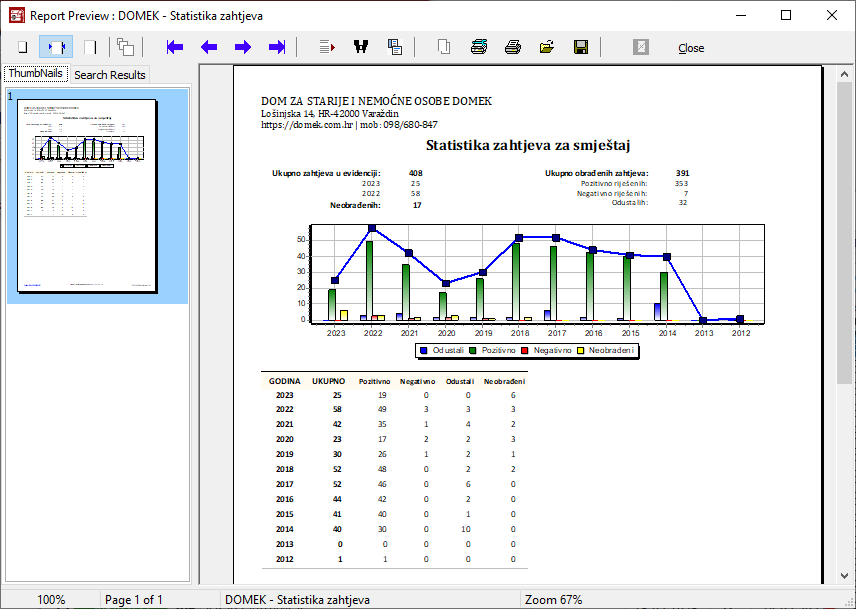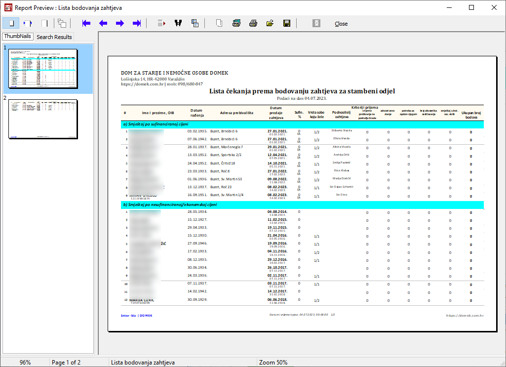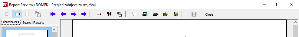 U gornjem dijelu prozora omogućena je manipulacija popisom - filtriranje i sortiranje prema različitim uvjetima, kao i pretraga prema osnovnim poljima. Gumbom Ispiši omogućen je ispis popisa zahtjeva na pisač - sučelje za pregled izvješća prije ispis prikazuje slika 4.9.