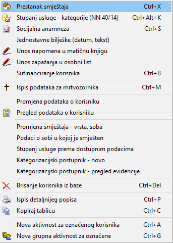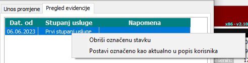 U bloku Usluge i napomene, slično kao što je opisano i kod unosa osnovnih podataka o korisnicima, omogućeno je definiranje usluga koje se koriste temeljem predmetnog Ugovora/Rješenja. Za svaku uslugu moguće je definirati i intenzitet/učestalost korištenja (na slici 4.16. vidljiv je padajući izbornik, spomenut već u odjeljku 4.3.1., kod opisa unosa usluga za korisnnika). Padajući izbornik, uobičajeno, se aktivira desnom tipkom miša iznad popisa usluga...