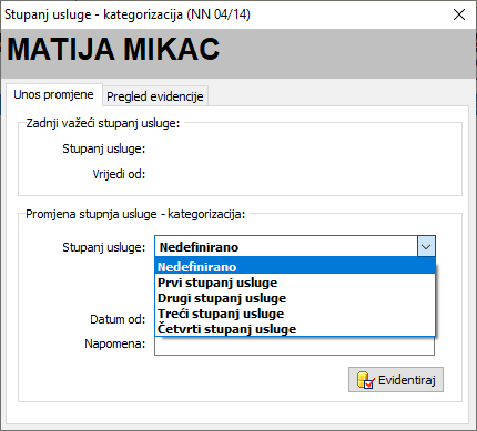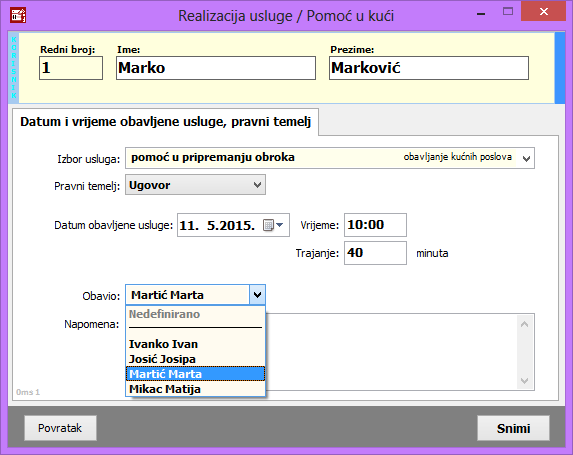Moguće je unijeti i trajanje obavljanja usluge, napomene po želji, te odabrati osoblje ustanove koje je obavilo samo uslugu! Osoblje koje obavlja usluge su u pravilu pomoćni djelatnici - dostavljači, gerontodomaćice... Osoblje je moguće definirati u glavnom prozoru, preko izbornika Podaci - Osoblje, što je ukratko opisano u nastavku.