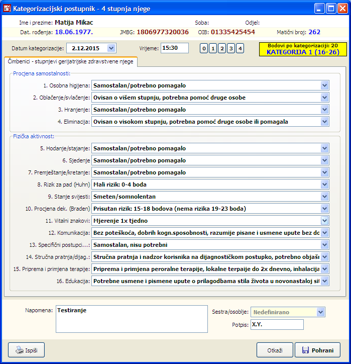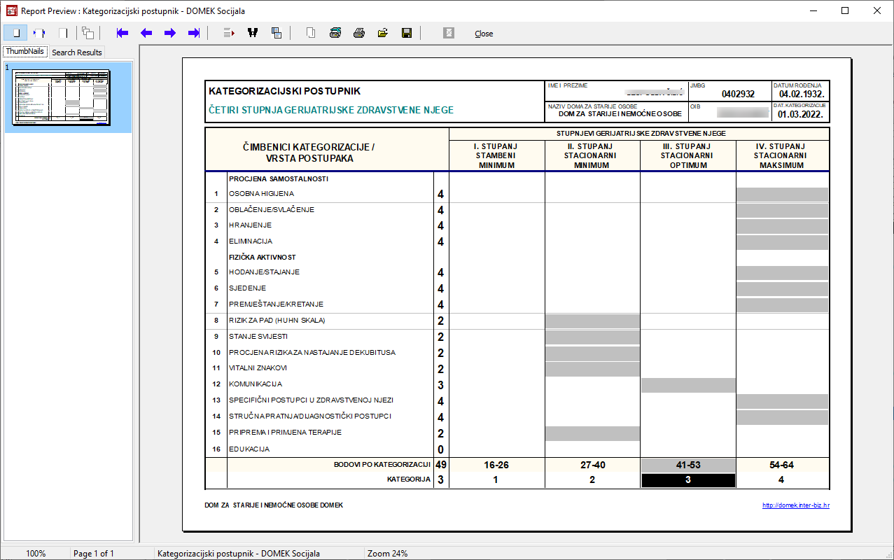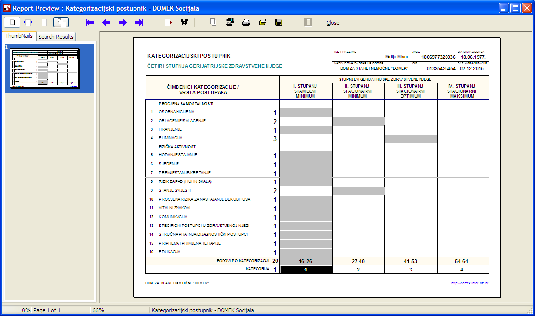 Jedan od obrazaca koji je inicijalno sadržan u modulu za pojačanu njegu, MedPlus, dostupan je i iz modula Socijala. Osim rada s obrascem i evidencijom kategorizacije (odjeljak 2.3.10), svaki kategorizacijski postupnik je moguće ispisati. Izgled obrasca i izvještaja je dan na slici.