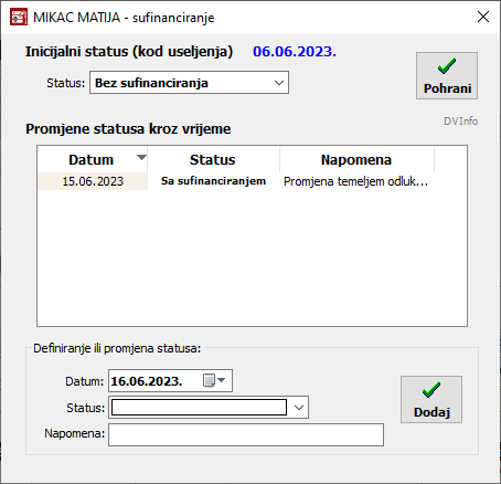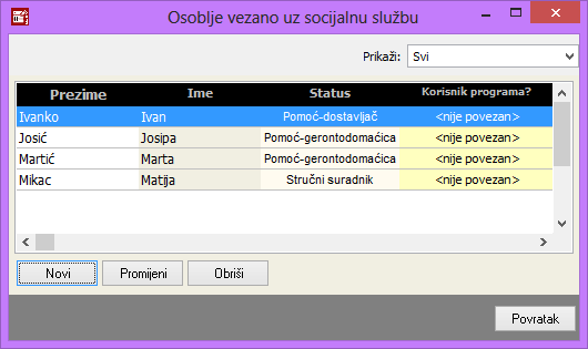 Prilikom unosa podataka o osoblju, moguće je odabrati status osoblja - zasad su ponuđene mogućnosti stručnog suradnika i pomoćnog osoblja - dostavljača, gerontodomaćice i ostalog osoblja.