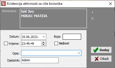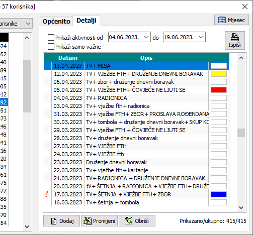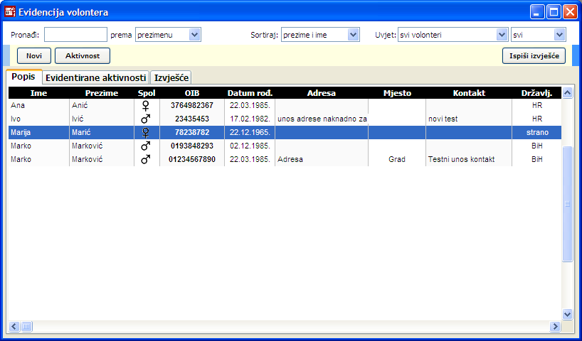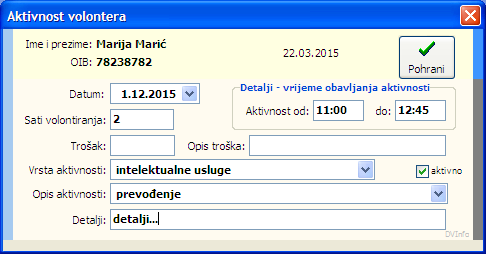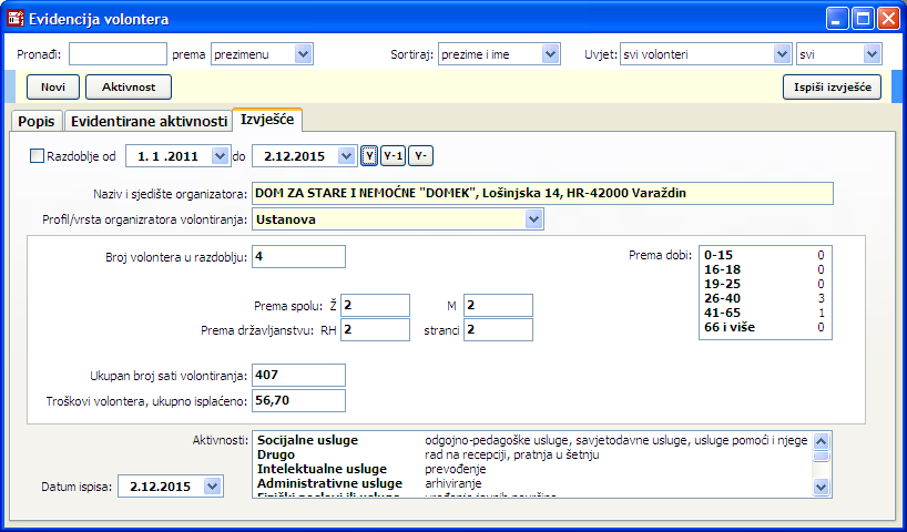 U gornjem dijelu prozora nalaze se elementi za manipulaciju popisom, te gumbi za brzo dodavanje novog volontera ili evidentiranje novih aktivnosti pojedinih volontera (gumb Aktivnost). Sučelje za unos aktivnosti prikazuje slika u nastavku teksta.