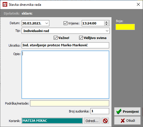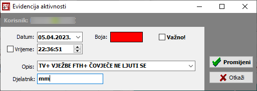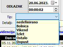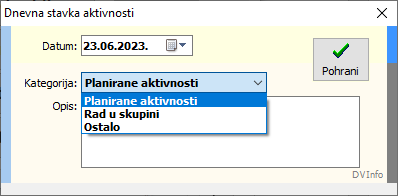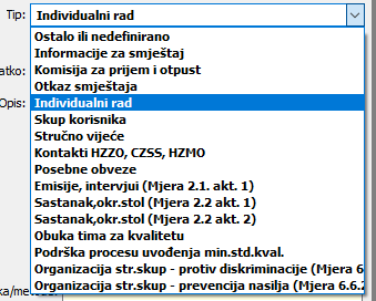 Kao što je vidljivo na slici definiraju se podaci o datumu, početku i završetku aktivnosti, informacija o trošku (ako postoji) i vrsti aktivnosti. Podržane su sljedeće vrste aktivnosti, uz predefinirane opise aktivnosti:
