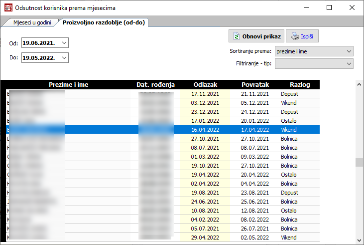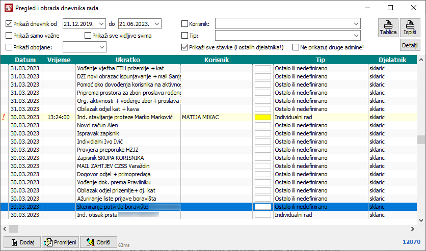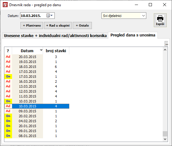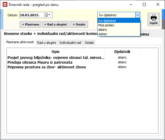 Popis je moguće sortirati prema datumu ili tipu zapisa - padajućim ili rastućim slijedom. Evidenciju je moguće ispisati u obliku obrasca koji sadrži sve tražene informacije.