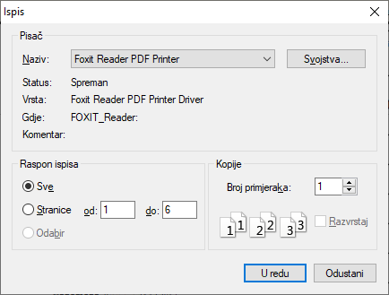 U donjem dijelu prozora nalazi se gumb Ispiši - tim gumbom pokreće se funkcija ispisa upisnika korisnika. Izgled sučelja za ispis izvještaja prikazuje slika 4.11.