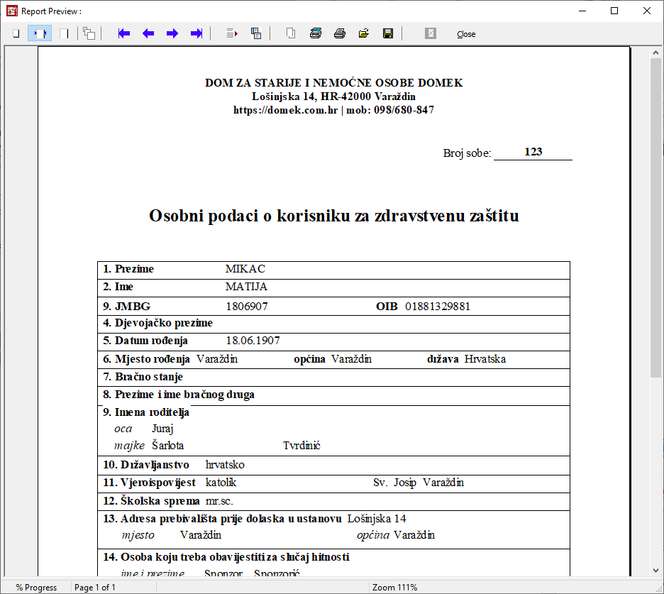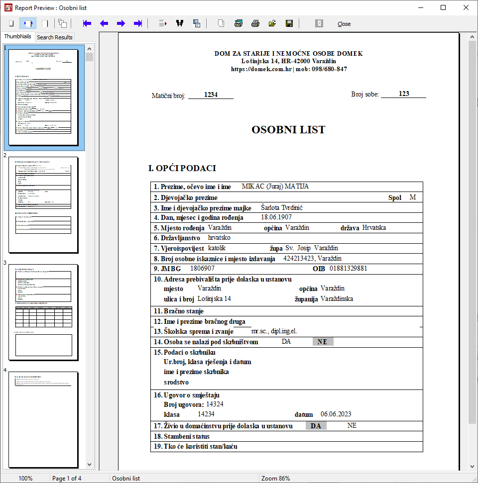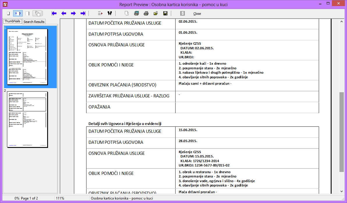 Sučelje preglednika izvješća/obrasca osobnog kartona prikazuju slike 4.18. i 4.19. Na 4.18. prikazan je izgled osnovnog, sažetog, obrasca (samo osnovni podaci i aktualni ugovor i usluge), dok 4.19. prikazuje izgled obrasca na kojem nakon aktualnog ugovora slijede podaci o preostalim evidentiranim Ugovorima i/ili Rješenjima.
