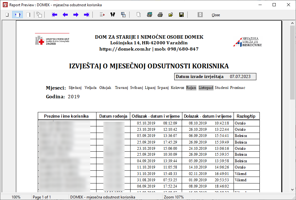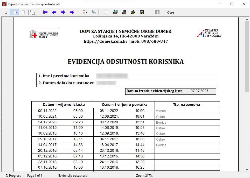 Izvještaj o evidenciji odsutnosti korisnika moguće je pokrenuti iz prozora za pregled korisnika (slika 18), izborom Zdravstvena služba u listi izvještaja i evidencija, te klikom na gumb Prikaz i ispis. Prozor sa obrascem spremnim za ispis je prikazan na slici 121 Najnoviji obrazac je vizualno nešto drugačiji, podržava logotipe te uključuje i podatke o obiteljskom i konzilijarnom liječniku. Stariji obrazac (do 2023., postoji i dalje kao izbor za ispis) prikazuje slika 122.