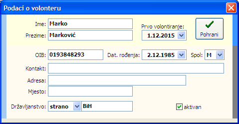 Osobe koji prvi puta volontiraju u ustanovi unose se u sustav izborničkom stavkom Novi (CTRL+F10). Sučelje za unos prikazuje slika - unose se generalije o volonteru, uključujući državljanstvo, kao i datum prvog volontiranja. Po potrebi se u određenim situacijama volonter može označiti kao neaktivan...