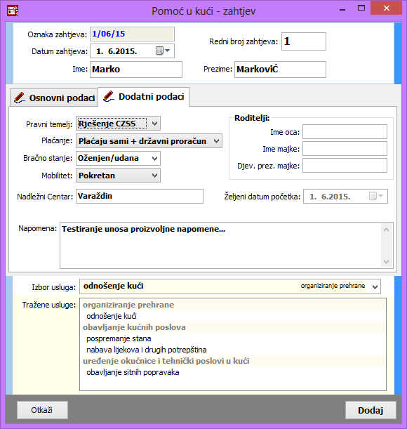 Pod Dodatni podaci unosi se pravni temelj, informacija o plaćanju, bračnom stanju, mobiliteti (funkcionalna očuvanost), nadležnom Centru, roditeljima i željenom datumu početka korištenja usluge. Nije obavezan unos svih podataka (obvezan je unos imena i prezimena te OIB-a podnositelja zahtjeva).