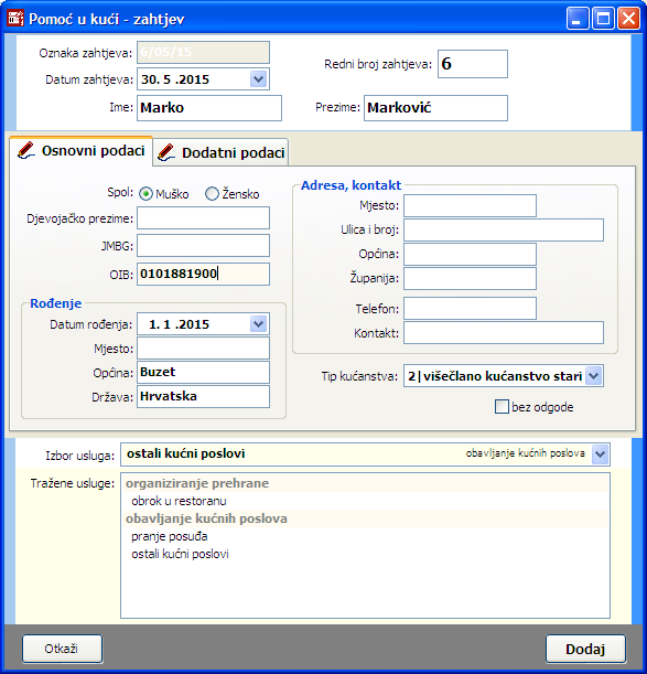 Sučelje za unos osnovnih podataka zahtjeva prikazuje slika 4.3. - u gornjem dijelu prozora nalaze se polja s imenom i prezimenom, datumom, oznakom i rednim brojem zahtjeva, dok donji dio prozora omogućava unos usluga. Kod novih zahtjeva moguć je unos dvije grupe podataka - Osnovni podaci i Dodatni podaci. Kod obrade postojećih zahtjeva sučelje se dodatno proširuje grupom Obrada zahtjeva.