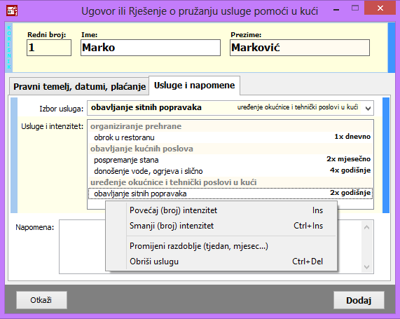 Vrlo bitan podatak je intenzitet korištenja usluga - u donjem dijelu grupe Osnova pružanja usluge omogućen je, slično kao i kod predaje zahtjeva, izbor usluga koje se pružaju korisniku. Osim izbora usluga, u popisu Usluge i intenzitet, uočljiva je i informacija o intenzitetu usluge - pri dodavanju usluge u popis (usluga se odabere u Izbor usluge i automatski prelazi u donji popis) postavlja se neka uobičajena vrijednost, ali je to u potpunosti moguće prilagoditi ugovorenom statusu - dovoljno je iznad popisa usluga desnom tipkom miša otvoriti padajući izbornik i u njemu odabrati neku od ponuđenih opcija - promjena broja (+/-, npr. povećanje intenziteta s 1x mjesečno na 2x mjesečno i slično), te promjena razdoblja (omogućeno je definiranje dnevno, tjedno, mjesečno i godišnje).