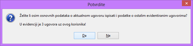 Program će po pokretanju ispisa (gumb Ispiši), ukoliko utvrdi da u popisu ugovora postoje određene stavke, postaviti pitanje da li se želi ispis koji će uključiti sve ugovore ili samo osnovni ispis (slika 4.17).
