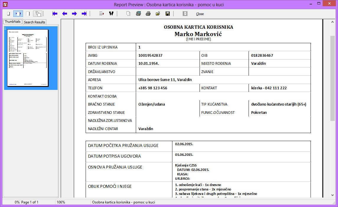 Slika 4.19 - ispis osobnog kartona korisnika - obrazac uključuje sve Ugovore u evidenciji