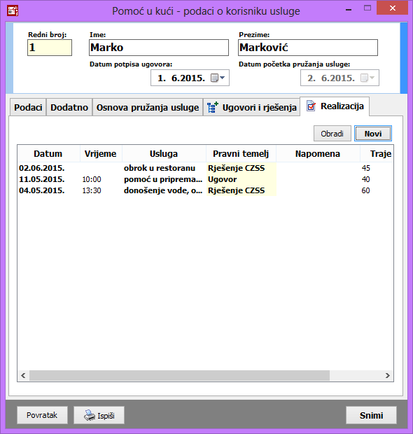 Za svakog korisnika je omogućeno praćenje realizacija usluga (to je bitna stavka, iako je mukotrpna za unos, jer osigurava mogućnost analize i sumacije u situacijama kad je potrebno popuniti određene statističke i druge obrasce koje zahtijevaju nadležna tijela) - pregled unesenih podataka moguć je u prozoru za korisnike, u bloku Realizacija (prikazano na slici 4.20.). Slično kao i kod unosa Ugovora, gumbima Novi i Obradi pokreće se unos nove realizacije odnosno modifikacije evidentiranih stavki (označena u popisu). Pregled i promjena je omogućena i dvoklikom miša na željenu stavku, a padajućim izbornikom (desna tipka miša) moguće je obrisati/ukloniti evidentiranu realizaciju iz evidencije.